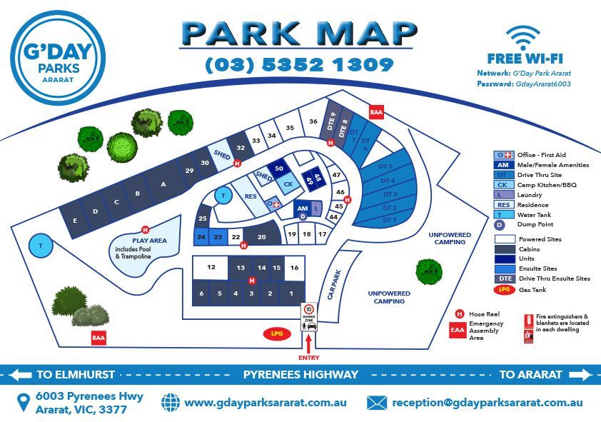 G'day Parks Ararat offer caravan, cabin and camping accommodation in beautiful Ararat, VIC. Choose between powered and unpowered site options to make your visit completely to your liking. Our caravan park is nestled in a quiet setting where you’ll enjoy the beauty of nature and the convenience of our many amenities. No matter what type of accommodation you choose, feel free to take advantage of our amenities:
